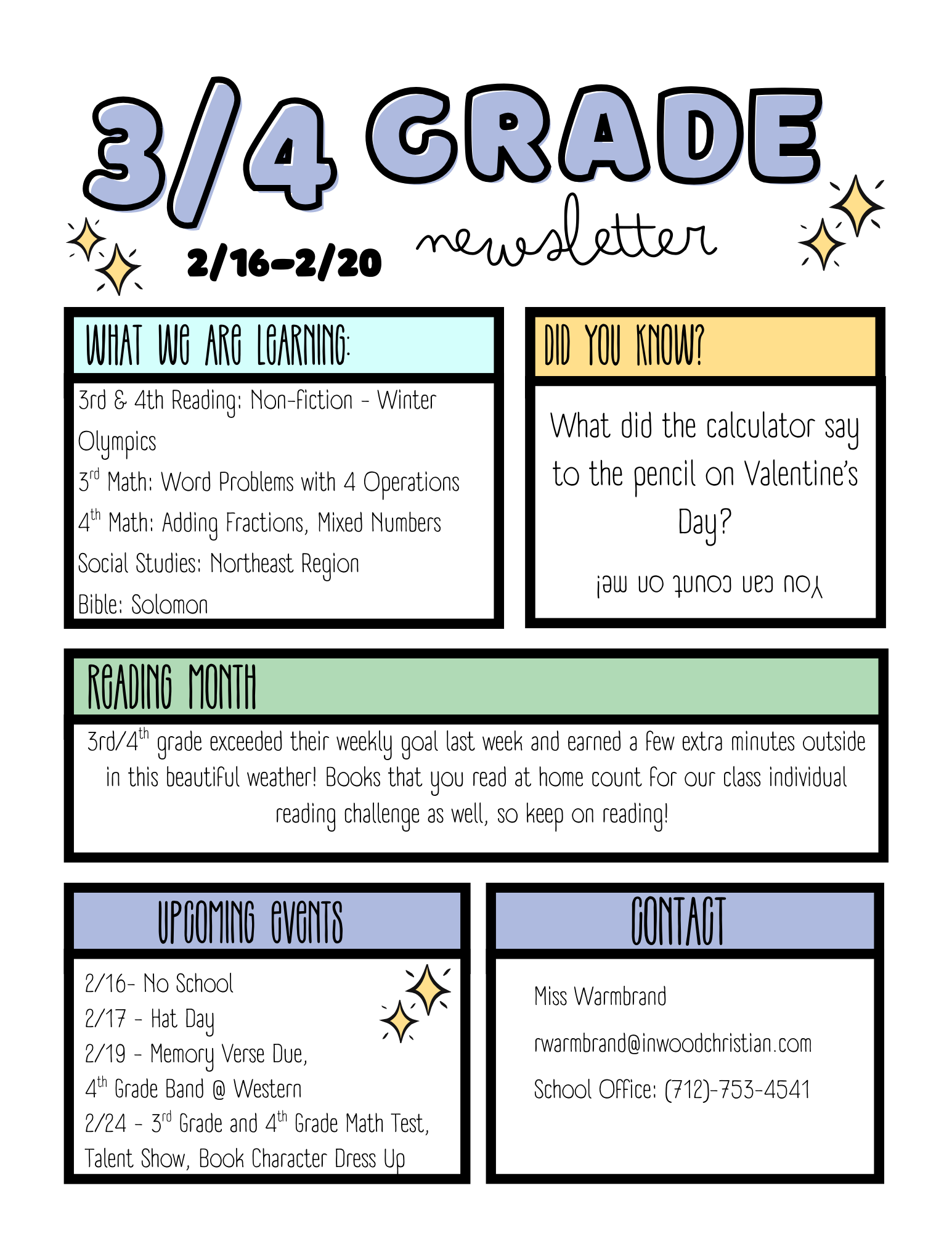 Please email me with any questions or schedule changes, or call the office for immediate needs at 712-753-4541. My email is: rwarmbrand@inwoodchristian.com